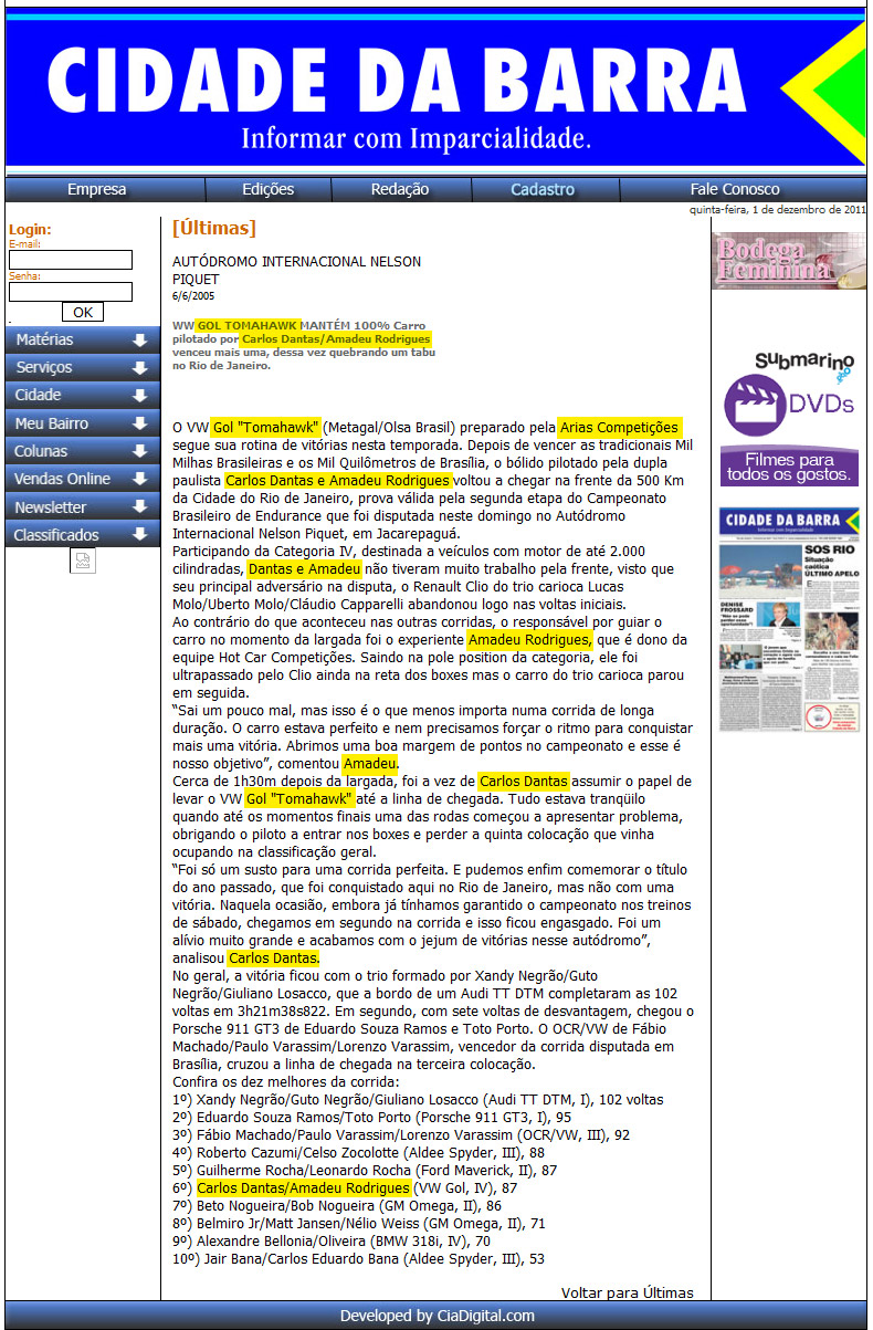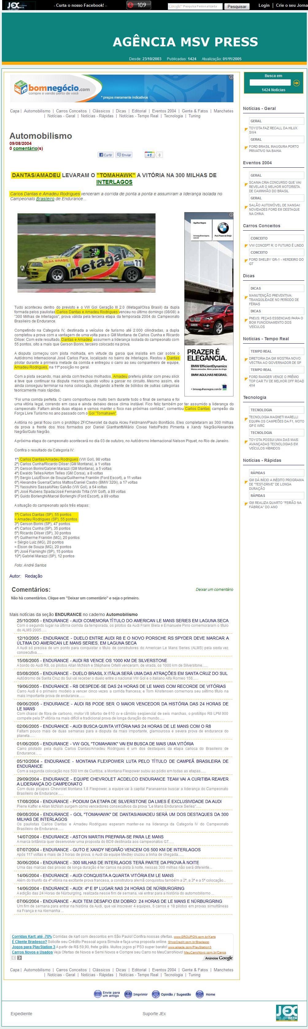 Os paulistas Carlos Dantas e Amadeu Rodrigues comemoraram ontem (06/11) o segundo título consecutivo no Campeonato Brasileiro de Endurance na Categoria IV, destinada a veículos de turismo... |