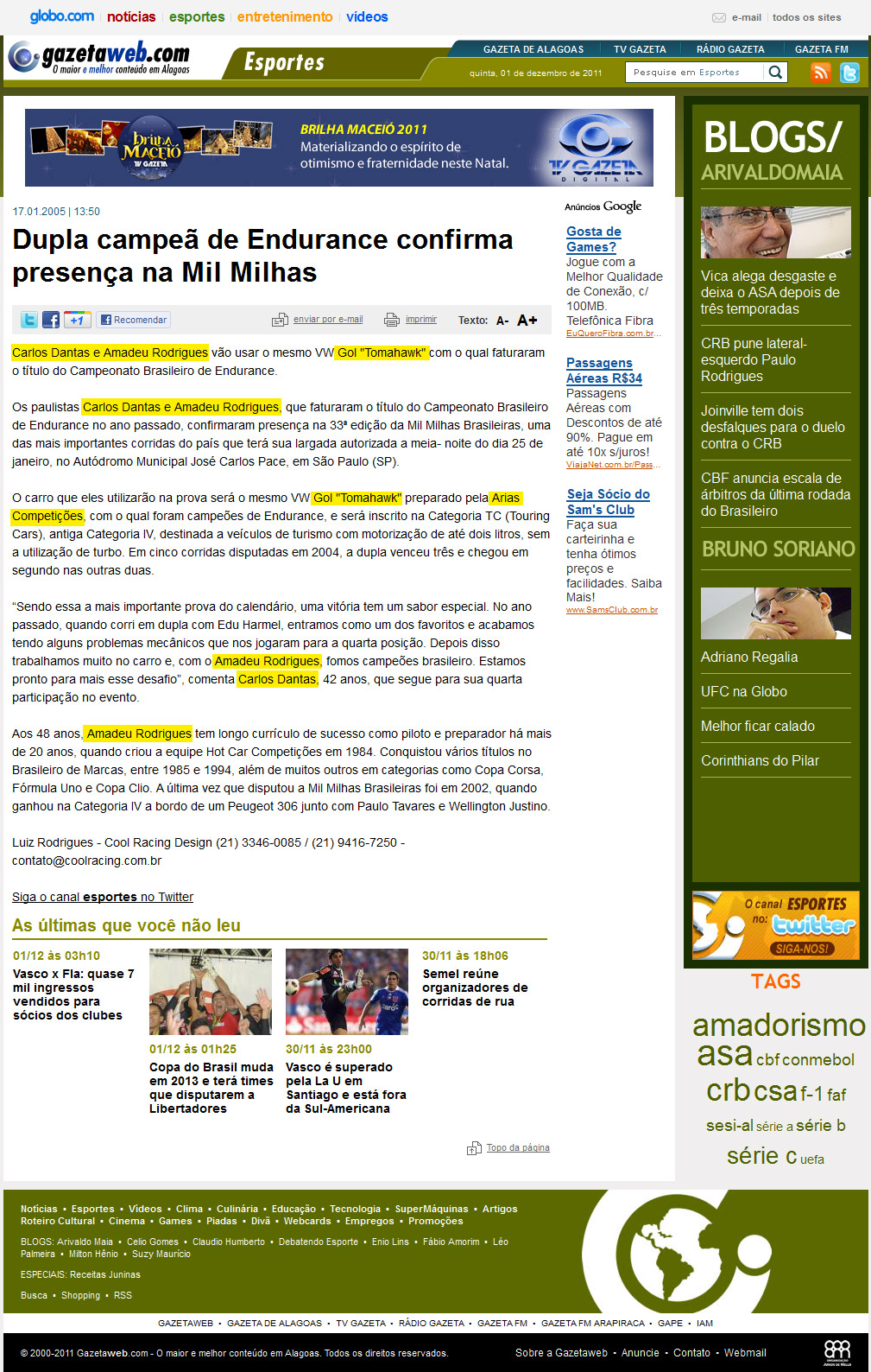 Em três corridas disputadas nessa temporada, duas delas válidas pelo Campeonato Brasileiro de Endurance, o VW Gol Tomahawk da dupla formada pelos paulistas Carlos Dantas e Amadeu Rodrigues vem mantendo a invencibilidade. |