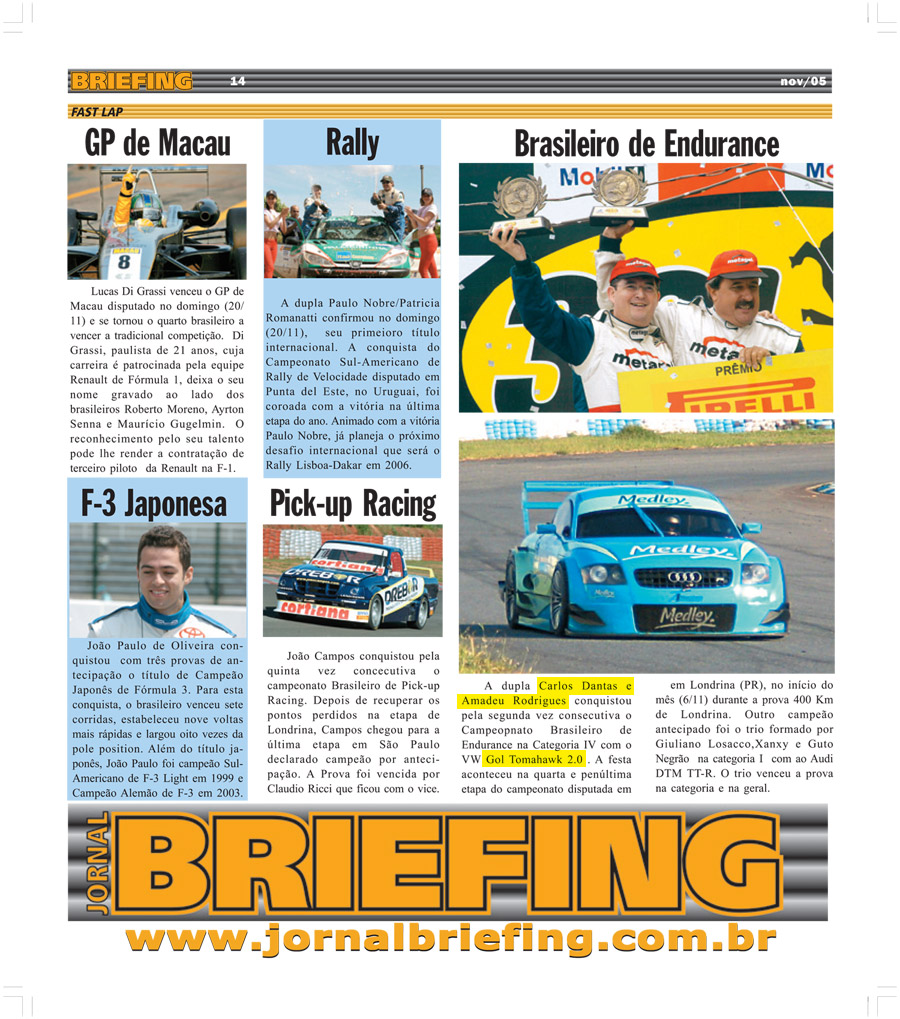 Mais que a busca pela inédita vitória na categoria Marcas de uma das mais tradicionais provas do calendário automobilístico nacional, Carlos Dantas estará disputando a corrida de despedida do "Tomahawk", Gol da Geração 3 com o qual conquistou o título do Campeonato Paulista da Força Livre em 2003, e a bordo do qual faturou o status de melhor no Brasileiro de Endurance em 2004 e 2005... |