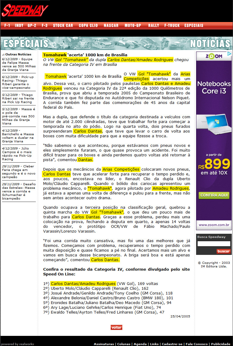 O carro da dupla é um VW Gol Geração III 2.0, preparado pela Arias Competições, com o qual Dantas faturou o título do Campeonato Paulista de Força Livre Turismo. O domínio foi tão absoluto que o piloto venceu 16 das 20 corridas disputadas e acabou recebendo o apelido de "Tomahawk", em alusão ao míssil subsônico usado pelo exército norte-americano. |